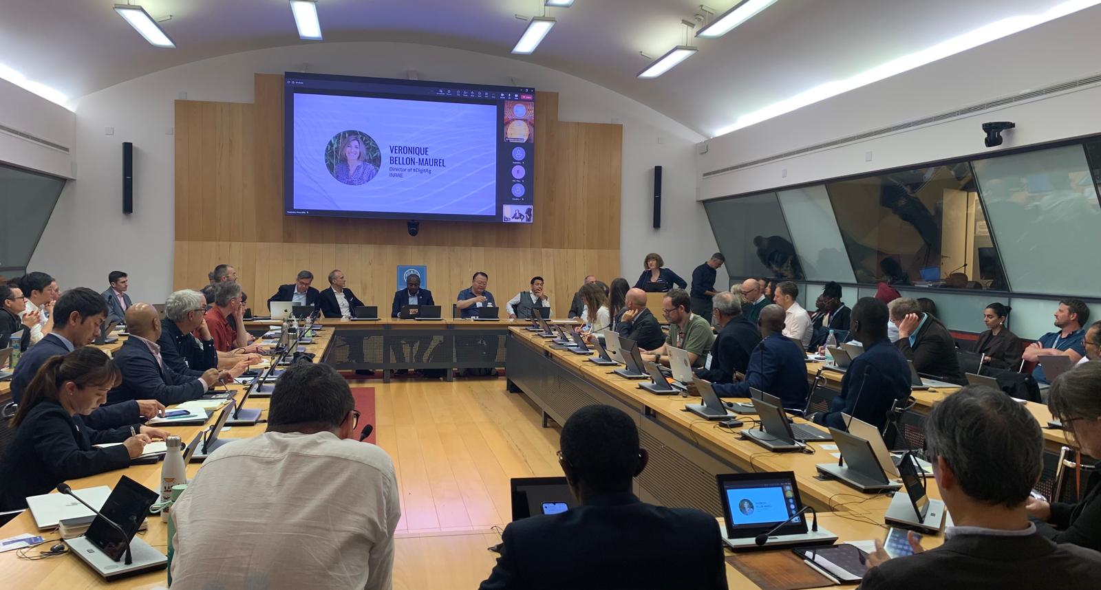 Comment accélérer l’innovation dans les domaines de l’intelligence artificielle et des technologies numériques pour l’agriculture ? Comment faire en sorte que tous les agriculteurs et toutes les agricultures du monde en bénéficient largement ? Quelles seraient les leviers technologiques et organisationnels essentiels à activer ? Comment conjuguer les expertises, les ressources et les forces en présence pour avancer ensemble dans cette direction ? Du 28 au 30 Avril, le bureau de l’innovation de la FAO, dirigé par le Dr Vincent Martin, a organisé à Rome trois jours de dialogue entre près de quatre-vingt-dix experts du monde entier :  chercheurs, consultants, représentants de l’industrie du numérique, organisations d’agriculteurs, bailleurs et acteurs institutionnels… La délégation française, emmenée par Raoul Mille, conseiller scientifique à la RP de la France auprès de la FAO, comptait une petite dizaine d’experts d’INRAE, du CIRAD et de l’IRD. V Bellon-Maurel, directrice de #DigitAg* l’institut Convergences Agriculture Numérique, a été invitée à donner l’un des quatre pitchs « agitateur d’idées » qui ont lancé l’imaginarium et ses ateliers de brain storming. Ces trois jours d’échanges et d’intenses interactions ont produit un riche contenu qui sera utilisé pour établir une « road-map » (feuille de route), pour continuer de mobiliser toutes les énergies de cette nouvelle communauté sur ce sujet majeur. Affaire à suivre au Forum FAO Science et Innovation 2025 !